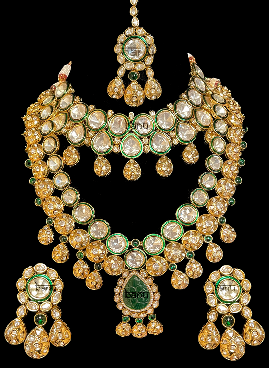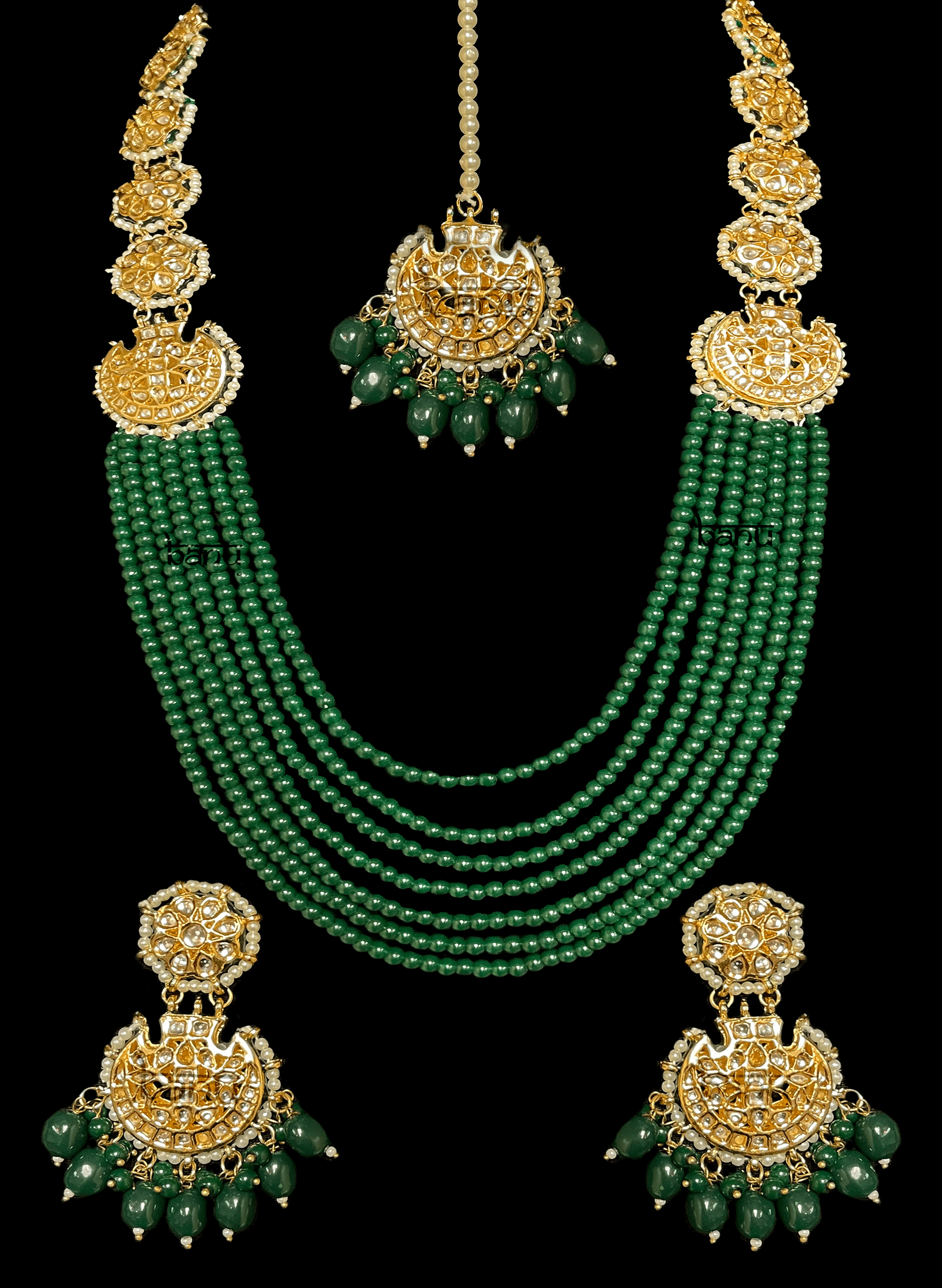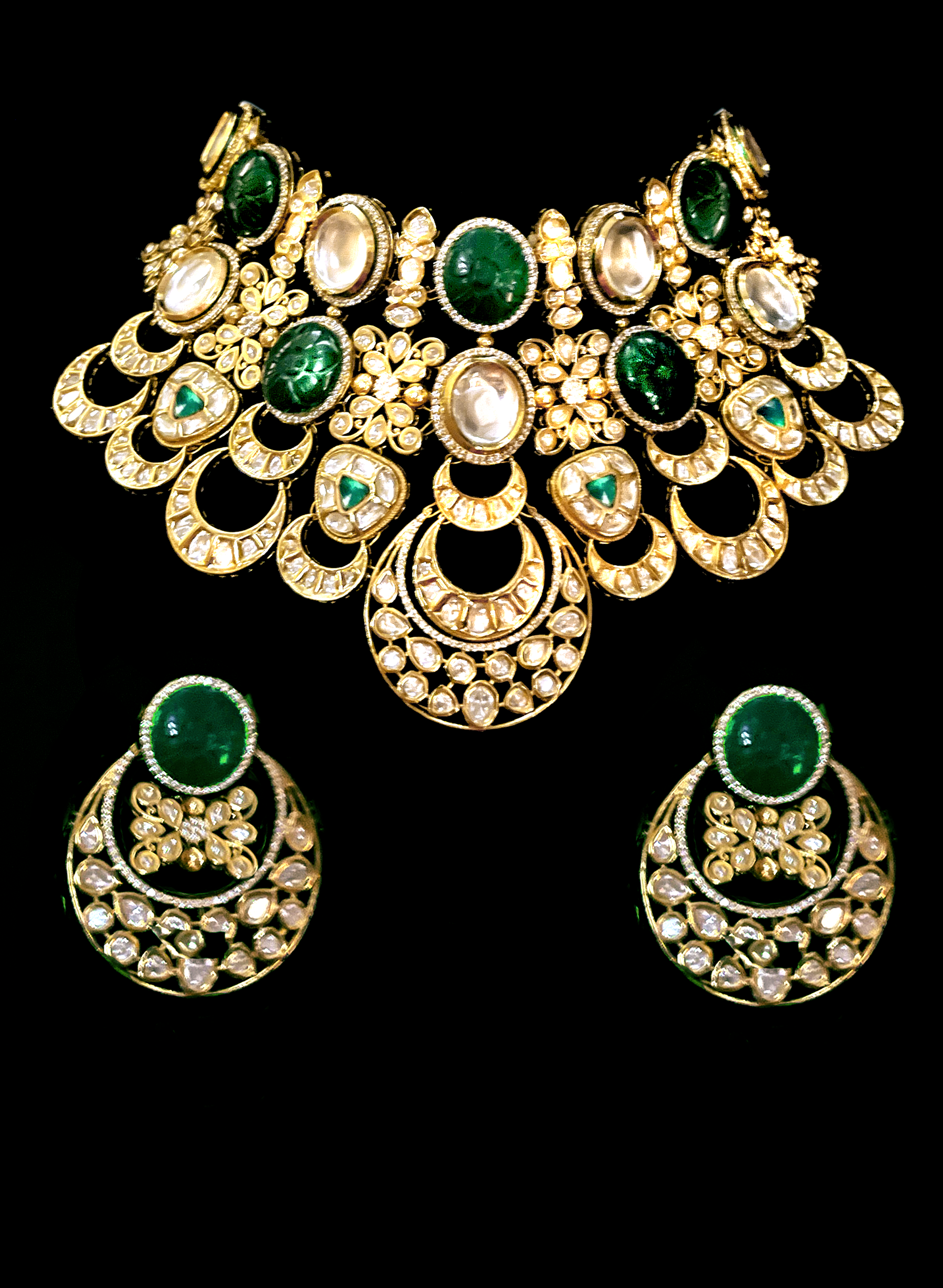 C. Polki Jewelry: For brides who love choker-style necklaces, consider pairing a statement Polki choker with a pearl-embellished Rani Haar. This combination creates a stunning contrast and adds depth to your Indian bridal jewelry ensemble.