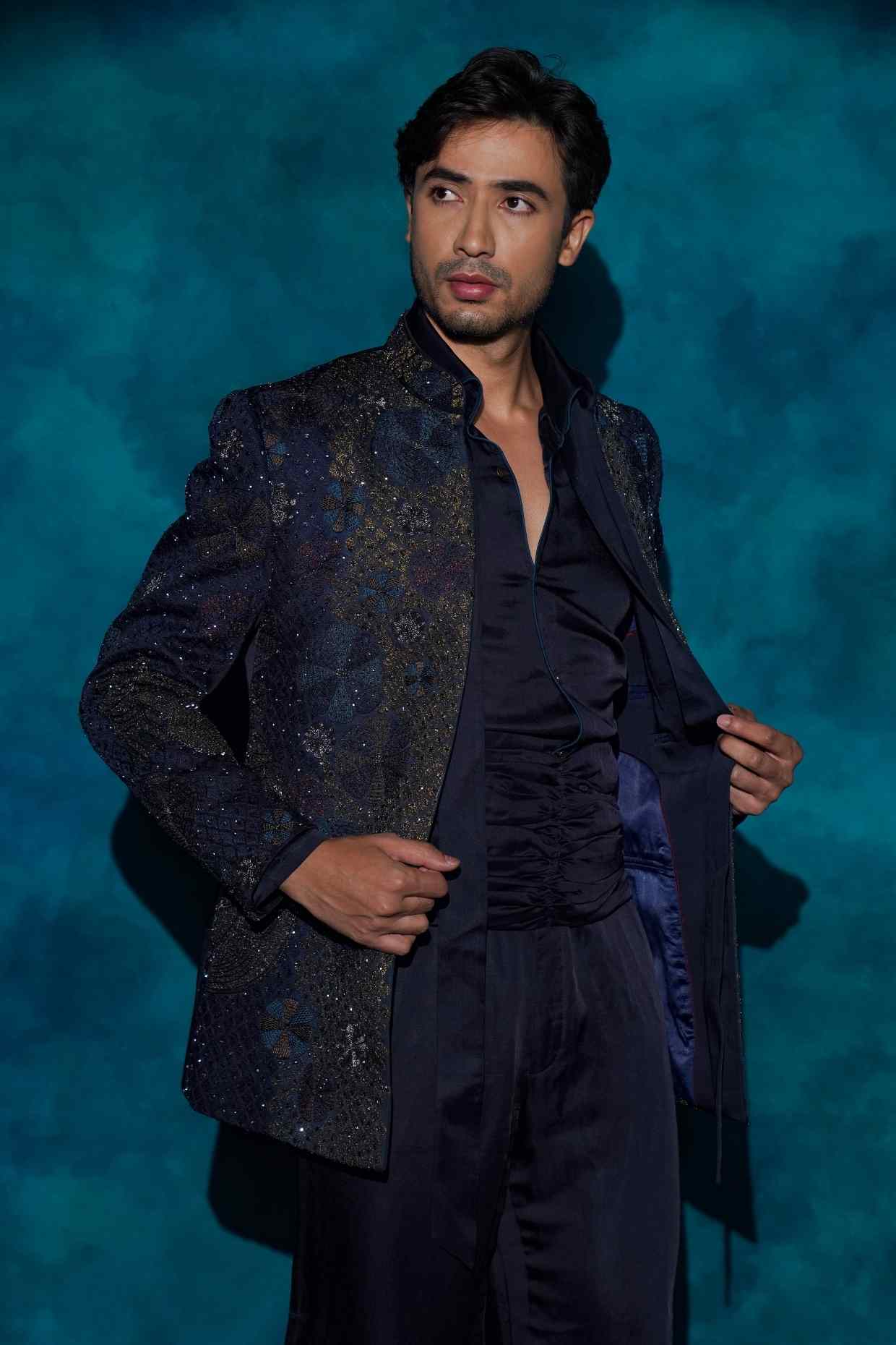 Midnight Blue Hand Embroidered Short Jacket Set | Jatin Malik