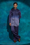 Presenting VYOM, our short jacket set in the striking Oceanic Purple hue. Hand-embroidered to perfection by skilled artisans using aari and zardozi techniques with resham and moti, this piece draws inspiration from Shiva as Pashupatinath — the eternal guardian of all living beings. A celebration of protection, strength, and compassion, the embroidery reflects the divine balance of nature and divinity. Paired with an ombre kurta and straight trousers.