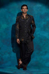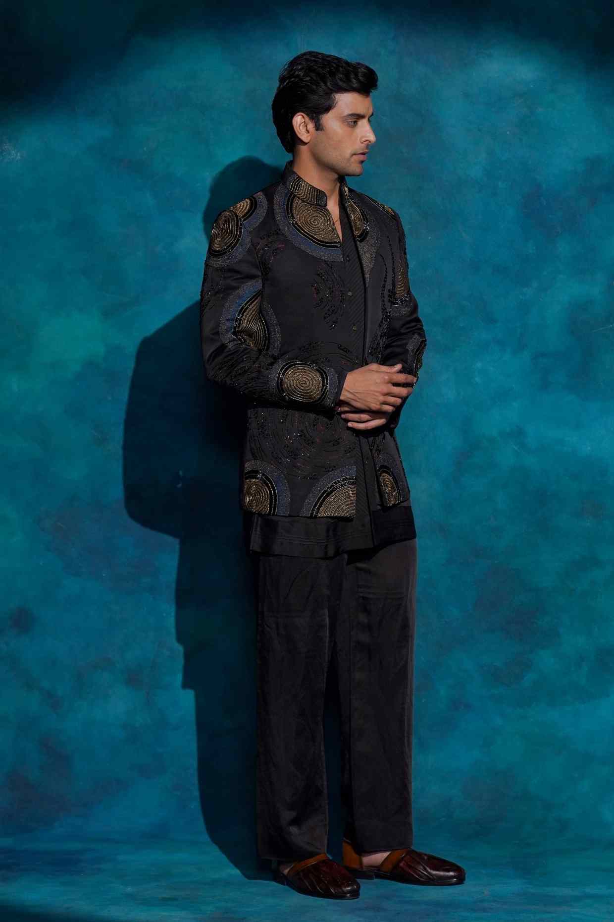 Presenting NEELKANTH, our open bandhgala in Black from the Shiva Collection. Hand-embroidered with zari, resham, organza, and elements using traditional zardozi techniques, this piece draws inspiration from Shiva’s trishul — the embodiment of the three gunas: sattva (balance), rajas (activity), and tamas (inertia). Symbolizing the cosmic energies that shape the universe, CHAKRA is a fusion of spirituality and craftsmanship. Paired with a shawl collar kurta and draped trousers.