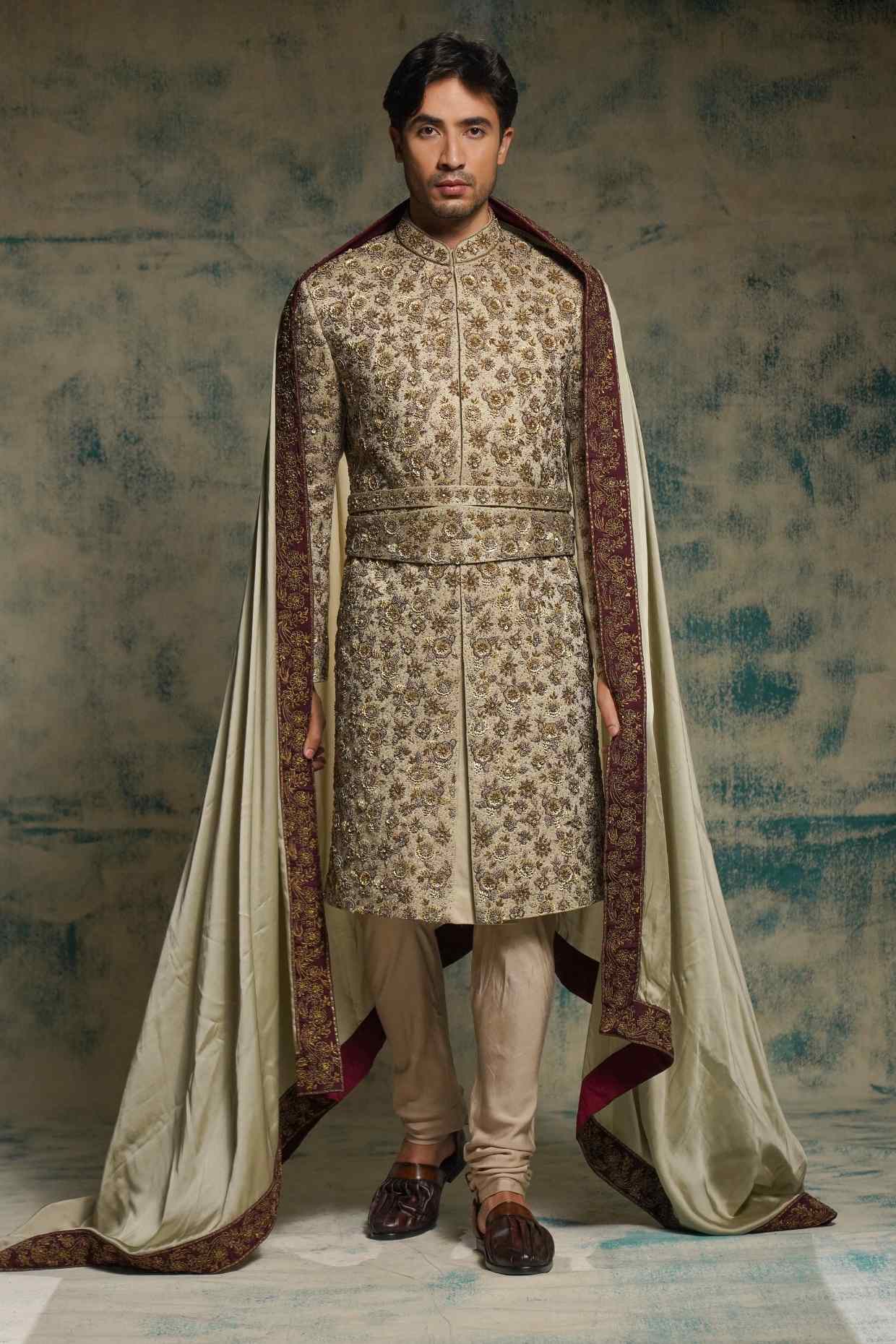 Presenting Sherwani Set from the Shiva Collection. Drawing inspiration from the boundless cosmic energies and the philosophy of Satyam Shivam Sundaram — truth, goodness, and beauty. Intricately hand-embroidered on a sand grey base with zari, sequins, stones, and metallic elements, showcasing craftsmanship at its finest.